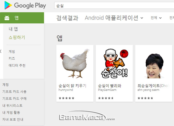 현재 구글 플레이에서 ‘순실’을 검색하면 게임 3종을 발견할 수 있다. ‘순실이 닭 키우기’와 ‘순실이 빨리와’, ‘최순실 게이트’ 등이다. 이 게임들은 지금도 많은 의혹이 제기되고 있는 ‘최순실 게이트’를 소재로 다룬 모바일게임으로, 관련 이슈를 각기 다른 방식으로 풀어냈다.