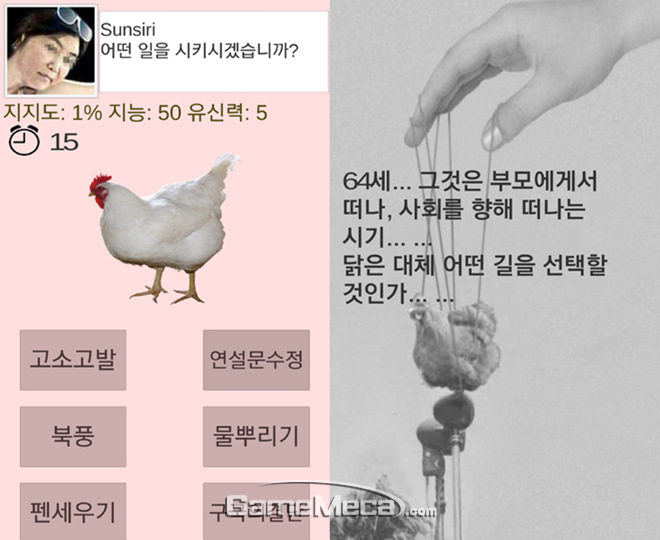 먼저 ‘순실이 닭 키우기’는 제목에서도 알 수 있듯 제한 시간 안에 ‘닭’을 빠르게 키워내는 것이 목표다. 게임을 시작하면 고소고발, 연설문수정, 북풍, 물뿌리기, 펜세우기, 구국의결단까지 선택지 6개가 등장하고 이 중 원하는 것을 고르면 지지도, 지능, 유신력과 같은 능력이 올라가거나 하락한다. 선택지에 따라 변화하는 능력이 다르며, 능력치에 따라 각기 다른 엔딩이 나온다.