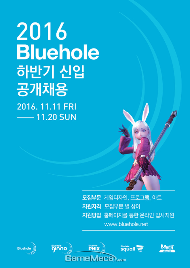 블루홀은 7일(월) 2016년도 하반기 신입 공개 채용 일정을 공개했다.