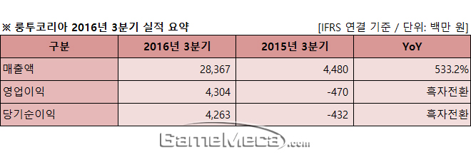 ▲ 룽투코리아 2016년 3분기 실적 요약