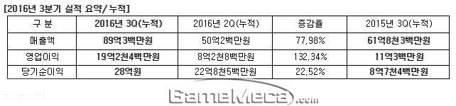 플레이위드는 9일, 2016년도 누적 실적(2016년 1월 1일부터 2016년 9월 30일까지)을 발표했다.