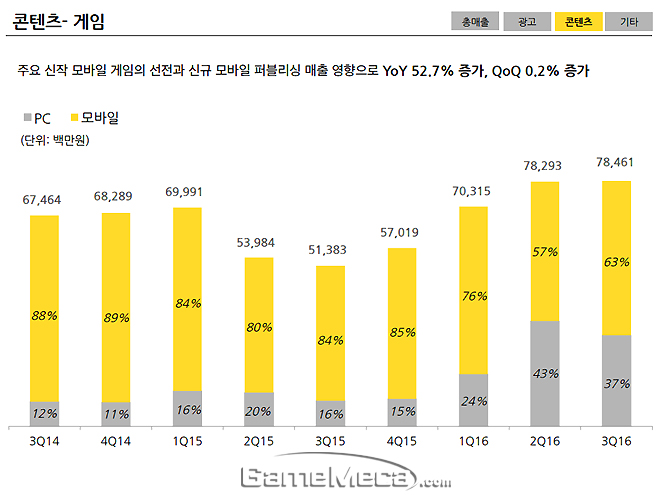 또한 게임매출 역시 상승세를 나타냈다. 2016 3분기에 카카오의 게임 매출은 785억 원으로 2015 3분기보다 52.7% 증가했다. 이에 대해 카카오는 '검과마법'과 같은 모바일 채널링 신작이 선전하는 가운데 자사가 직접 퍼블리싱하는 모바일게임 매출이 반영된 것이 그 원인이라 설명했다. 실제로 카카오는 지난 7월부터 국내 게임사와 힘을 합쳐 '아이러브니키', '놀라와 마이홈', '프렌즈 사천성' 등을 출시한 바 있다.