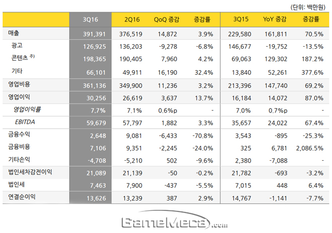 ▲ 카카오 2016년 3분기 실적 (자료제공: 카카오)
