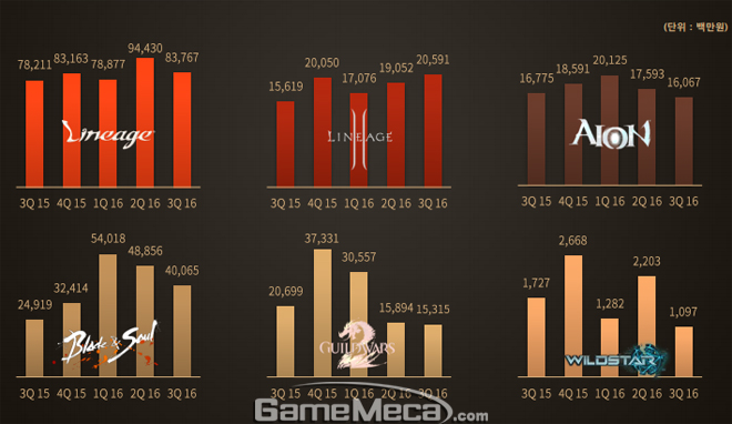엔씨소프트가 '리니지'와 '리니지 2', '블레이드앤소울'까지 주요 온라인게임의 견조한 실적을 바탕으로 2016년 3분기에 작년 동기보다 29% 많은 영업이익을 달성했다. 또한 이를 바탕으로 국내 매출 역시 작년 3분기보다 13% 올랐다.