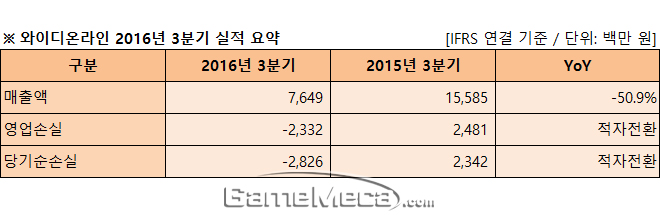 ▲ 와이디온라인 2016년 3분기 실적 요약