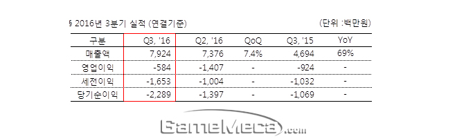 매출은 2015년 3분기보다 69% 늘었으며, 영업손실은 적자폭이 줄었다. 마지막으로 당기순손실은 2015년 3분기보다 적자폭이 늘어났다.