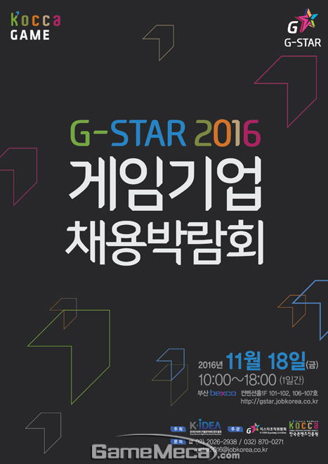 한국인터넷디지털엔터테인먼트협회가 주최하고, 지스타조직워원회와 한국콘텐츠진흥원의 공동 주관하는 지스타 2016 게임기업 채용박람회가 오는 18일 오전 10시부터 오후 6시까지 부산 벡스코 컨벤션홀 1층에서 열린다.