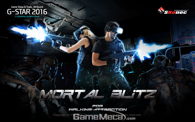 '모탈 블리츠 for 워킹 어트랙션'은 직접 걷고, 총기를 집는 등의 실제 행동을 게임에 반영해 몰입감을 느끼게 하는 VR 게임이다. 이번 지스타 2016에서 공개되는 버전은 연말 국내외에 출시되는 버전과 동일한 것이다.