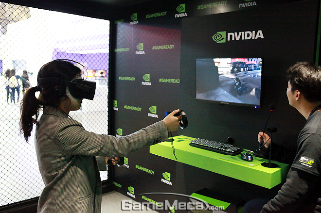 현장에서 엔비디아는 자사의 그래픽카드 '지포스 GTX 1080'을 기반으로 한 VR 게임 시연을 선보였다. 먼저 오큘러스 리프트 관을 통해서는 '디 언스포큰(The Unspoken)'과 '로보리콜(Robo Recall)', HTC 바이브 관에서는 'VR 펀 하우스(VR Fun House)'가 전시됐다. 지스타 기간 중 매일 하루 두 차례 진행된 현장 선착순 예약이 30분 만에 매진됐다고 덧붙였다.