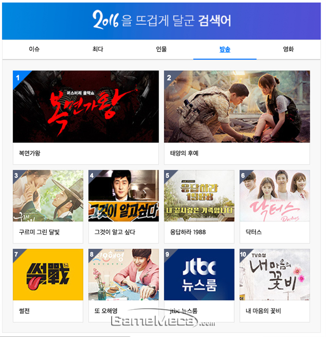 예능 프로그램이 강세였던 작년과 달리, 올해는 다양한 종류의 방송이 시청자들 관심을 끌었다. 올해 유저들이 가장 많이 검색한 방송 프로그램은 1위는 ‘복면가왕’이었으며, 드라마로는 ‘태양의 후예’가 2위, ‘구르미 그린 달빛’가 3위, ‘응답하라 1988’ 5위로 순위에 차례로 올랐다. 이 외에도 ‘그것이 알고 싶다’와 ‘jtbc 뉴스룸’도 순위에 올랐는데, 이는 사회적 이유에 대한 국민적 관심이 높았던 결과로 보인다.