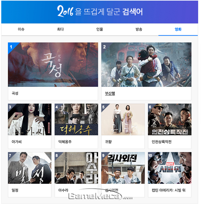 마지막으로, 영화 카테고리에서는 한국 영화가 강세를 보였다. 올해 최다 검색 영화 1위를 ‘곡성’이 차지했으며, 2위는 ‘부산행’이 오르는 등 1위부터 9위까지가 모두 한국 영화로 채워졌다. ‘캡틴아메리카: 시빌 워’ 는 10위를 기록하며, 외화로는 유일하게 Top10에 이름을 올렸다.