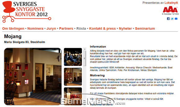 후보 선출과 관련해 ‘Sveriges snyggaste kontor 2012’ 공식 홈페이지에 게재된 모장의 설명에는 내일의 블록버스터 비디오 게임을 만들기 위해서 창의적이고 비전 있는 환경이 필요하다. 여기에 우리의 목표는 스웨덴 최고의 정돈된(neatest) 사무실이다고 게재돼 있다.