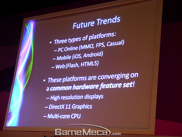 또, 라스 버틀러 대표는 앞으로 게임은 `프리투플레이(부분유료화)` 방식의 비즈니스모델을 지향해야 한다고 언급했다. 부분 유료화 방식이 정착된 국내와 달리 북미와 유럽일대는 지금도 플랫폼 별로 상품을 구입하는 과정이 다른데, 스마트 혁명을 일으키기 위해서는 이 과정 역시 간소화해야 한다는 의미. 북미에서도 부분 유료화를 도입하는 시도가 늘고 있는데, 최근 `길드워2` 등의 온라인게임이 지난 북미게임과 다른 비즈니스모델을 선택한 것이 변화의 증거다.