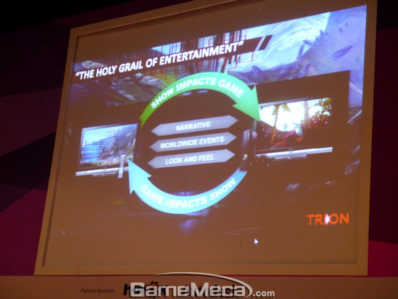 `리프트`로 그 이름을 널리알린 트라이온월드는 `엔터테인먼트`를 주력으로 내세웠다. 온라인 플랫폼이 주력이긴 하지만, 기존에 없던 새로운 MMORTS 장르로 개발되고 있는 `엔드오브네이션`과 티비 드라마와 게임이 세계관을 공유하고 함께 성장해 나가는 `디파이언스` 등을 공개해 눈길을 끌었다.