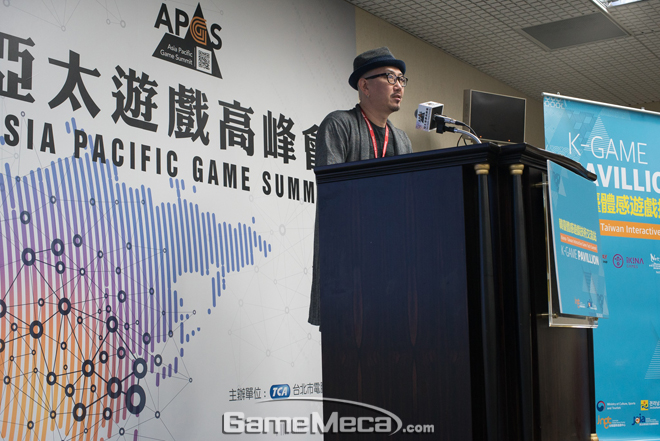 ▲ 타이베이게임쇼 현장에서 강연 중인 바른손이앤에이 윤용기 대표