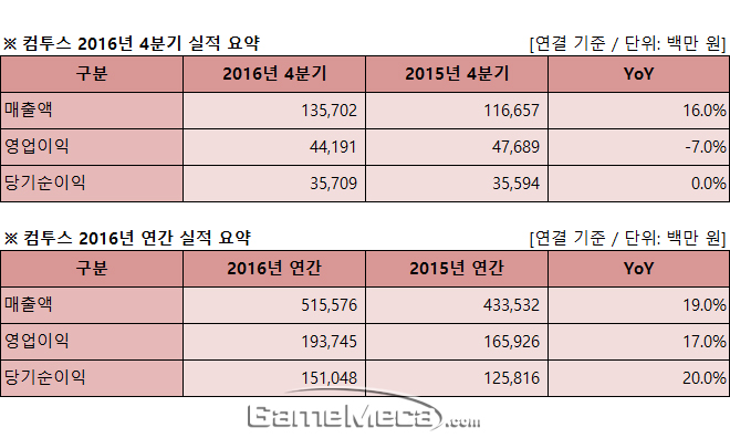 이에 따르면 컴투스 2016년 4분기 매출은 1,357억200만 원으로 전년 동기 1,166억5,700만 원 대비 16% 상승했으나, 영업이익은 441억9,100만 원으로 전년 동기 476억8,900만 원 대비 7% 감소했다. 당기순이익은 357억900만 원으로 전년 동기 355억9,400만 원과 대동소이하다.