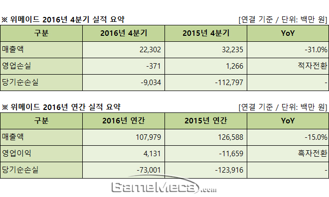 이에 따르면 위메이드 2016년 4분기 매출은 223억200만 원으로 전년 동기 322억3,500만 원 대비 31% 감소했으며, 영업손실은 3억7,100만 원으로 적자전환했다. 당기순손실은 90억3,400만 원으로 전년 동기 1,127억9,700만 원 대비 적자폭이 많이 좁혀졌다.