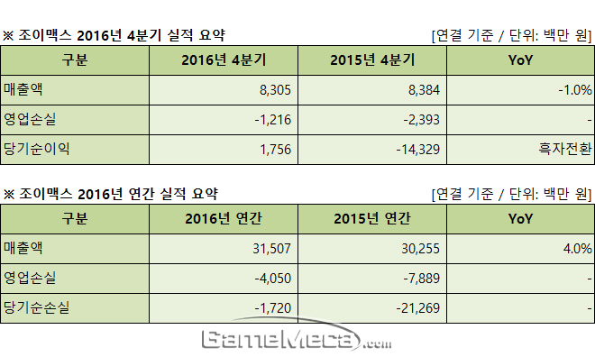 ▲ 조이맥스 2016년 4분기 및 연간 실적 자료 (사진출처: 게임메카 제작)