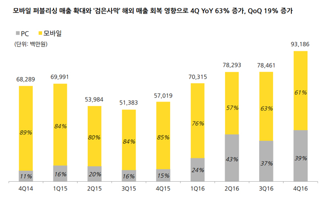 이 가운데 단연 돋보이는 것은 게임 매출이다. 2016년 게임 매출은 3,202억 원으로 전년 대비 38% 증가했다. 특히 4분기에만 ‘데스티니차일드’, ‘프렌즈팝콘’, ‘쿵푸팬더 3’ 등 신작 흥행과 ‘검은사막’, ‘에오스’ 등 PC 퍼블리싱 게임의 매출 호조로 2,215억 원을 벌어들였다.