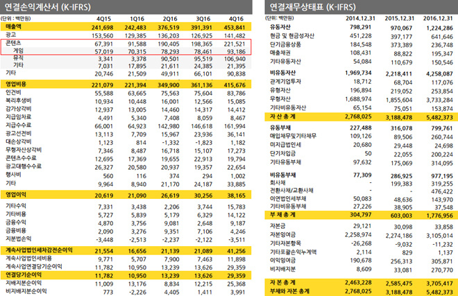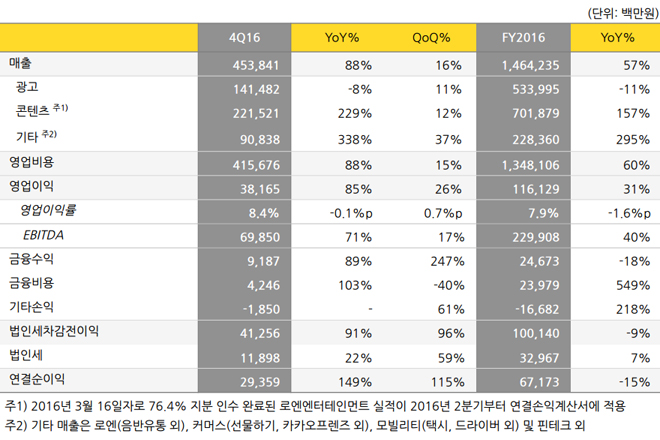 ▲ 카카오 2016년 연결 실적 상세 자료 (자료제공: 카카오)