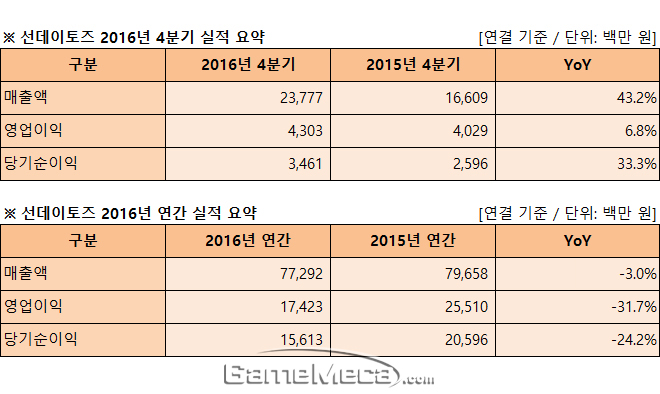 ▲ 선데이토즈 2016년 4분기 및 연간 실적 자료 (사진출처: 게임메카 제작)