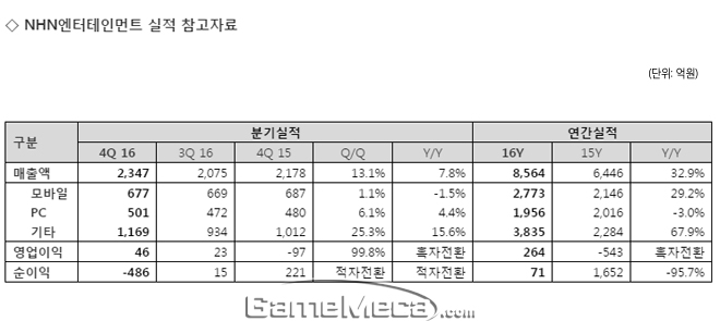 NHN엔터테인먼트는 2월 10일, 자사의 2016년 연간 및 4분기 실적을 발표했다. NHN엔터테인먼트는 2016년 한 해 동안 매출 8,564억 원, 영업이익 264억 원, 당기순이익 71억 원을 기록했다. 2015년보다 매출은 32.9% 늘었으며 영업이익은 흑자전환했다. 마지막으로 당기순이익은 95.7% 줄었다.