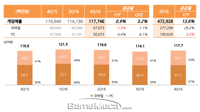▲ NHN엔터테인먼트 2016년 플랫폼별 게임 매출 추이 (자료제공: NHN엔터테인먼트)