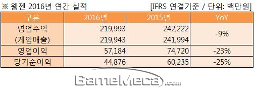 ▲ 웹젠 2016년 연간실적 (사진출처: 게임메카 제작)