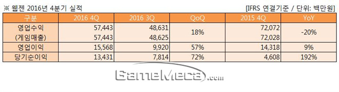 ▲ 웹젠 2016년 4분기 실적 (사진출처: 게임메카 제작)