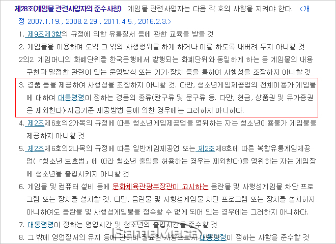 제28조 제3호는 경품 제공 시 사행성을 조장해선 안 된다는 것이며, 제32조 제1항 제2호는 심의 받은 것과 다른 내용을 소비자에게 제공하지 말라는 내용이다.