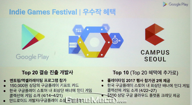 10대 우수작에 오르면 서울에서 열리는 개발사 행사 '플레이타임 2017' 참가권 2매와 500달러에 달하는 구글 클라우드 플랫폼 크래딧이 증정된다. 마지막으로 3대 우수작에 선정되면 2만 달러 상당의 구글 클라우드 플랫폼 크래딧과 함께 '풍월량' 등 유명 유튜브 크리에이터가 직접 게임을 다룬 콘텐츠 제작을 지원한다.