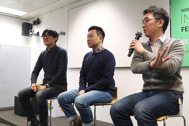 ▲ 왼쪽부터 나날이스튜디오 박재환 대표, 아이들상상공장 김상헌 대표, 구글플레이 게임산업 부문 장현세 부장 (사진출처: 게임메카 촬영)