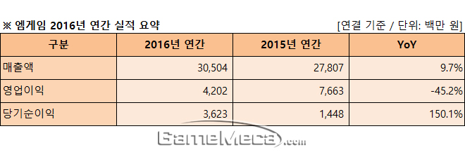 ▲ 엠게임 2016년 연간 실적 요약 (자료제공: 엠게임)
