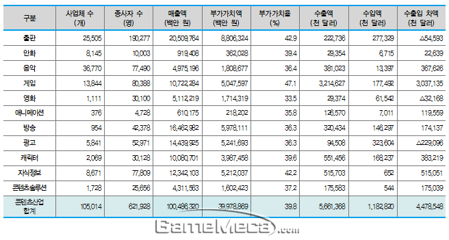 문화체육관광부는 2월 28일, '2016 콘텐츠산업 통계조사'를 발표했다. 이번 조사는 2015년을 기준으로 게임을 비롯한 국내 콘텐츠산업 11종의 주요 수치를 담은 것이다. 매출과 수출액, 업체 수와 종사자 수를 이를 통해 확인할 수 있다.