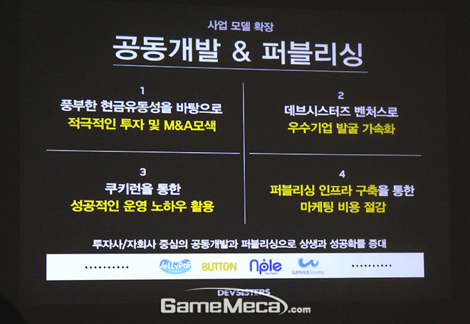 이러한 다수의 신작 라인업은 데브시스터즈 단독이 아닌, 자회사 및 투사자 협력으로 공동개발된다. 지난해 말부터 진행해온 자회사 설립 및 외부 투자가 어느 정도 규모를 갖추면서 개발 협력은 물론 퍼블리싱 사업에 도전할 토대가 마련됐다.