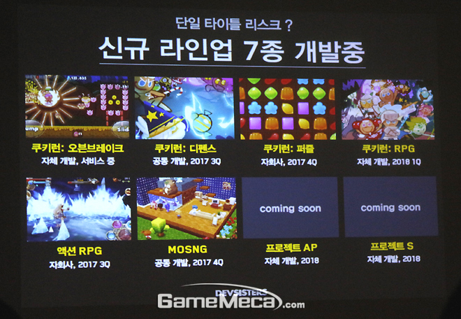 ‘쿠키런’과 별개의 완전 신작도 4종 준비 중이다. ‘쿠키런’이 지닌 캐주얼한 이미지를 벗어나, 보다 높은 연령대를 노린 라인업이다. 4분기 선보일 ‘프로젝트: 액션RPG’와 ‘프로젝트: MOSNG’, 2018년 나올 전략대전게임 ‘프로젝트 AP’와 ‘프로젝트 S’가 그 주인공이다.