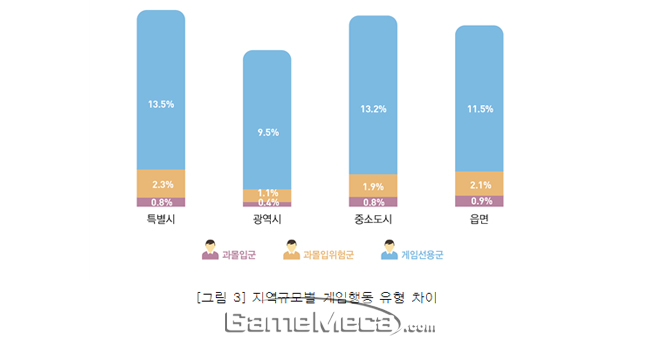 지역 규모 별로는 읍면의 '과몰입군' 비율이 0.9%로 타 지역에 비해 높았으며, '과몰입위험군' 비율은 특별시 2.3%, 읍면 2.1%, 중소도시 1.9%, 광역시 1.1% 순으로 나타났다.