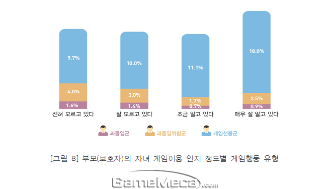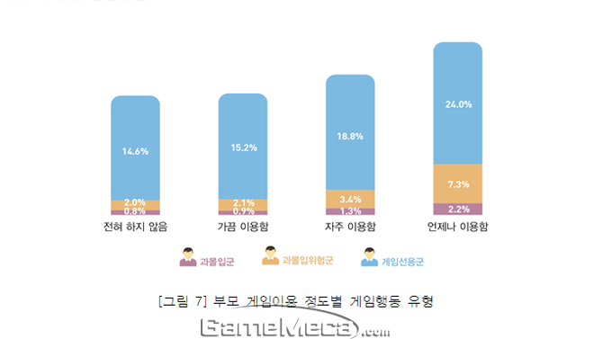 부모의 게임이용 정도에 따른 자녀의 게임행동 유형 조사에서는 부모의 게임이용 정도가 높을수록 자녀의 '과몰입군' 및 '과몰입위험군' 비율도 높아지는 것으로 나타났다.