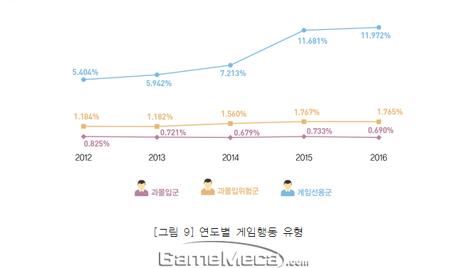 그리고 조사 결과 건전하게 게임을 이용하는 '게임선용군'이 증가했다는 것이 한국콘텐츠진흥원의 설명이다. 2015년에는 전체 응답자 중 11.7%가 '게임선용군'으로 분류됐는데 2016년에는 12%로 비중이 늘어난 것이다.