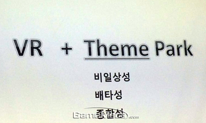 그렇다면 VR 테마파크에 적합한 게임이 무엇이냐가 관건으로 떠오른다. VR 테마파크 전문가 4인을 통해 이에 대한 자세한 내용을 들어볼 수 있었다. 3월 9일 코엑스에서 열린 VR EXPO' 컨퍼런스 현장에는 VR 테마파크를 주제로 한 강연 4종이 진행됐다. 롯데월드와 바른손과 같이 VR 테마파크 사업을 직접 진행하는 사업자는 물론 VR 어트렉션(놀이기구) 전문 제작사 2곳이 2시간 동안 관련 강연을 진행했다.