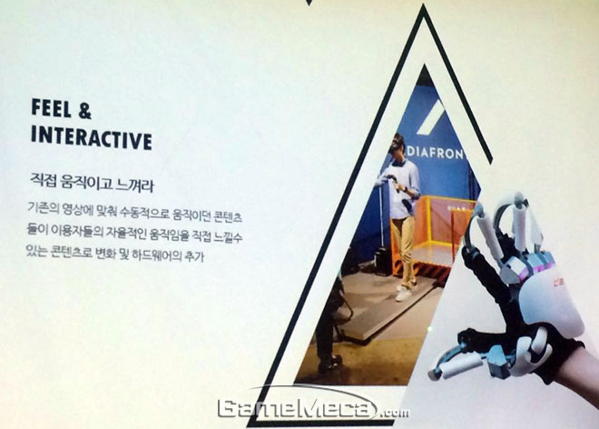 바른손 박재하 팀장은 "만약 활용할 수 있는 공간이 넓다면 사용자가 걸으며 즐기는 것도 괜찮다. 만약 그렇지 않다면 '옴니'와 같은 트레드밀(런닝머신처럼 제자리에 서서 걸을 수 있는 VR 기기)을 활용하는 것도 괜찮다"라며 "작은 소품을 활용하면 좀 더 현실감을 높일 수 있다. 같은 곳을 걷더라도 평지를 걷는 것과 널빤지 위를 걷는 것은 느낌이 다르다"라며 사용자 앞에 널빤지를 놓고 그 위를 걷게 하는 작은 연출만으로 생동감을 크게 높일 수 있다고 전했다.