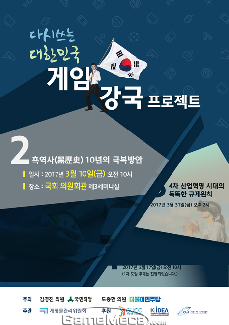 국민의당 김경진 의원과 더불어민주당 도종환 의원은 오는 3월 10일, 국회의원회관 제 3 세미나실에서 '다시쓰는 대한민국 게임강국 프로젝트-흑역사 10년의 극복방안'를 주제로 포럼을 주최한다.