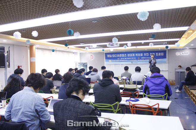 한국게임기자클럽과 한국게임미디어협회, 한국모바일게임협회, 게임개발자연대, 인디라!인디게임개발자모임, 게임인연대는 25일(토), 서울 역삼동 디캠프에서 게임/미디어콘텐츠 생태계 복원을 위한 정책 토론회를 주최했다. 현장에는 각 협회·단체 대표자와 기자 등 게임인은 물론 문재인, 안희정 캠프 정책담당자도 자리해 함께 머리를 맞댔다.