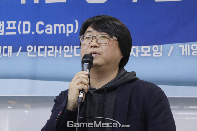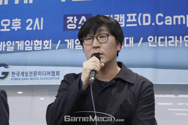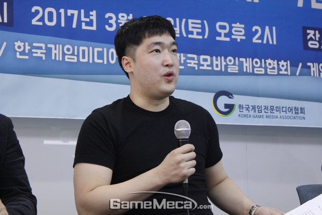 ▲ 낡은 심의제도를 비판한 게임개발자연대 김환민 국장 (출처: 게임메카 촬영)