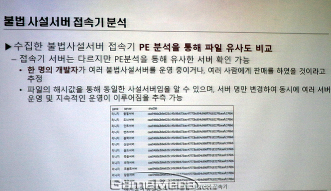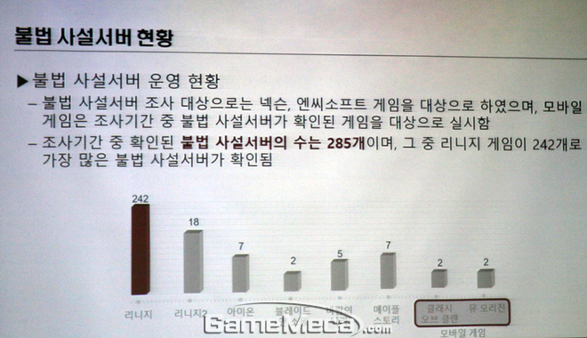 눈길을 끈 부분은 불법 서버 피해 규모를 추산한 것이다. 불법 서버가 어느 정도나 있는지, 그로 인한 피해가 어느 정도인지를 가늠해본 것이다. 고려대학교 김휘강 교수는 “한국 게임 역사에서 가장 오랜 서비스 기간을 가진 엔씨소프트와 넥슨 위주로 실태파악을 해보았다”라며 “그 결과 조사기간 중 확인된 불법 서버 수는 285개이며 그 중 ‘리니지’가 242개로 가장 많았다. 모든 불법 서버를 검색하는 것은 불가능하기에 이는 전체의 40%에서 50% 정도로 봐야 한다”라고 설명했다.