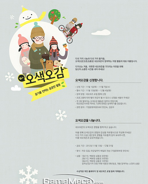 공모 기한은 다음달 31일까지이며, 1위부터 3위까지 수상자들에게는 백화점 상품권을 차등적으로 지급하고, 모든 참여자들에게는 사내 카페테리아 무료 이용 쿠폰을 증정한다. 또한 수상작은 네오위즈 마법나무재단과 네오위즈 홈페이지에 소개될 예정이다.