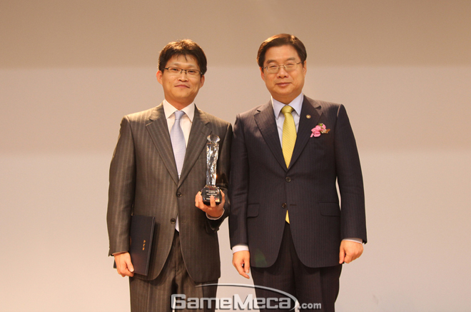 ▲ 2012 직무발명제도 운영 최우수상을 수상한 네오위즈게임즈 권용길 CTO(좌)와 김호원 특허청장(우)