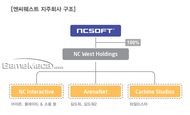 엔씨소프트는 12일 서울에서 이사회를 열고 북미·유럽 조직의 지주회사로 ‘엔씨웨스트 홀딩스’(NC West Holdings)를 12월 24일 설립하기로 결의했다고 밝혔다. 기존 퍼블리싱 총괄 조직인 '엔씨인터렉티브’(NC Interactive, 시애틀)와 '길드워2' 개발 조직인 ‘아레나넷’(ArenaNet, 시애틀)의 주식 전량은 지주회사에 현물 출자되며 엔씨웨스트 홀딩스의 지분 100%는 엔씨소프트가 갖는다.