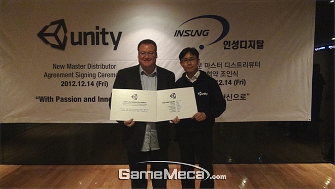 유니티 테크놀로지스 코리아는 12월 14일 가든파이브 CGV 영화관에서 인성디지탈과 마스터 디스트리뷰터 협약을  맺고 한국 비즈니스 확대를 적극 추진한다고 밝혔다. 이날 조인식에는 유니티 아시아 지역 총책임자 존 굿데일을 비롯해 양사의 대표 관계자가 참석했다.