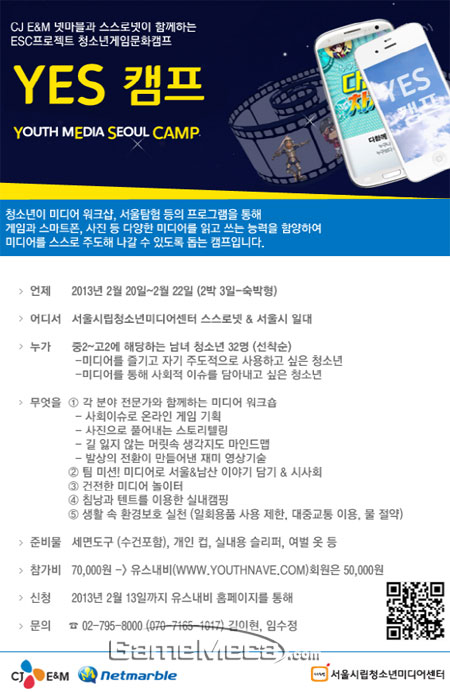 CJ E&M 넷마블은 서울특별시립청소년미디어센터와 함께 오는 2월 20일부터 22일까지 2박 3일간 ‘청소년게임문화 YES캠프’를 개최한다.